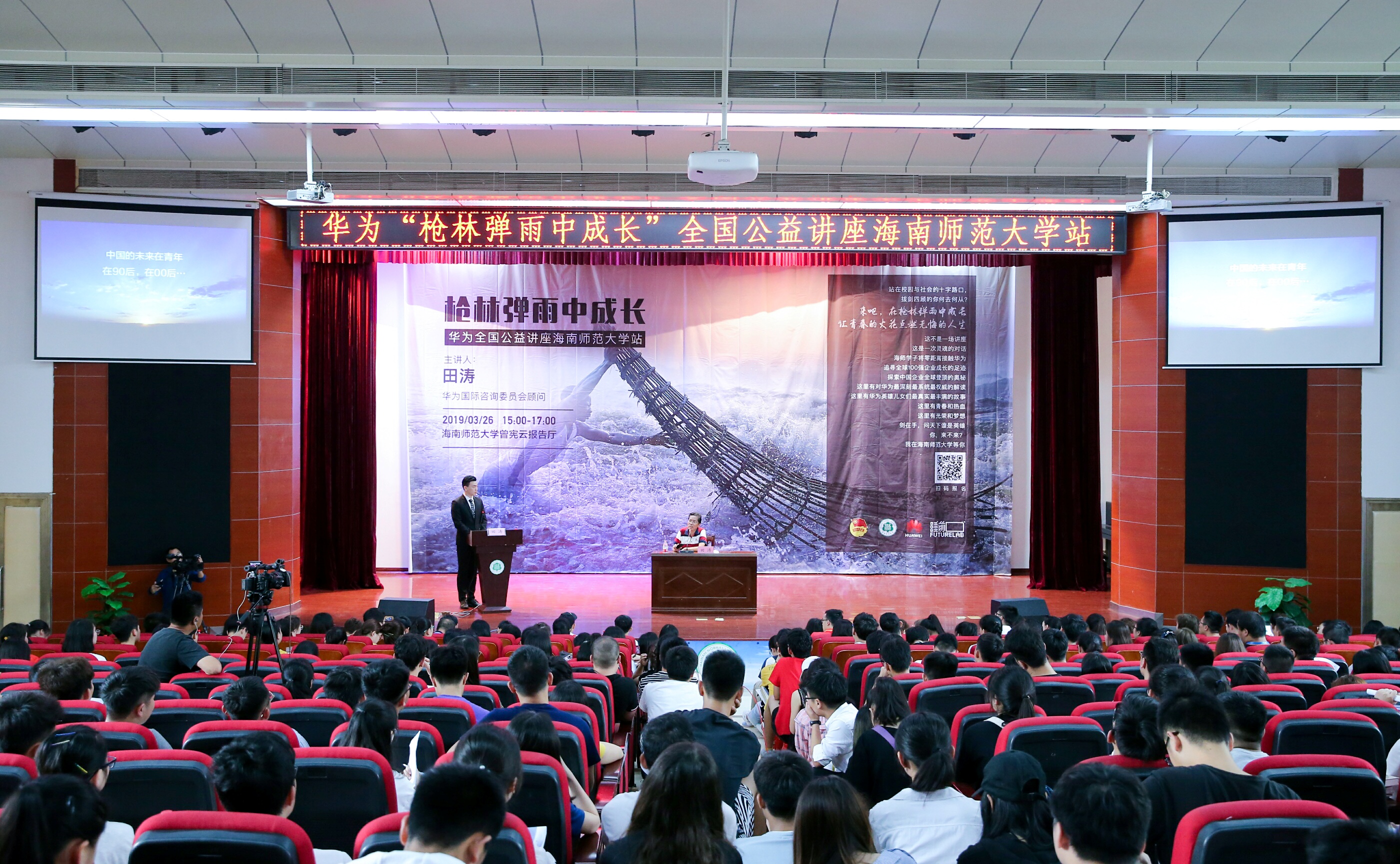 3月26日下午,华为“枪林弹雨中成长”全国巡回公益讲座海南师范大学站在桂林洋校区曾宪云报告厅举行。华为国际咨询委员会顾问、浙江大学睿华创新管理研究所联系所长、剑桥中国管理研究中心联系主任田涛为我校学子讲述了华为5万泛90后员工奋斗的故事,激励我校大学生在校期间刻苦学习,努力读书,学习先进的文化科学知识,为梦想和理想奋斗,校内外600余名大学生聆听了讲座。